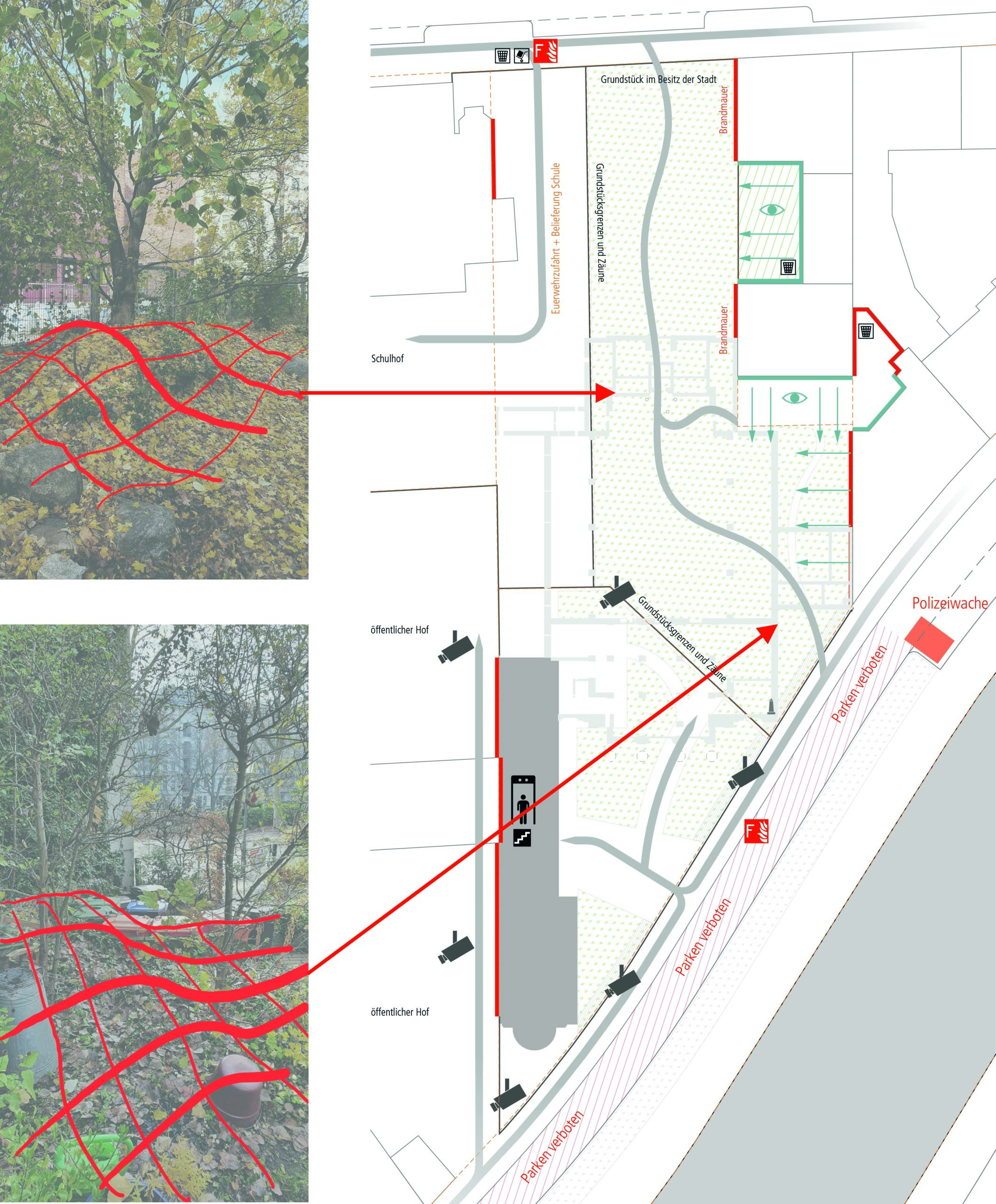 Zu 3: Die Nachbarschaft behält einen Teil ihres gewachsenen Grünraums – samt Blick auf die Freiflächen und Fenster in den Brandwänden. Das spricht für eine kompakte Bauform mit grünem Saum, landschaftsarchitektonisch qualifiziert, aber nicht überformt. Der Neubau wird dadurch nicht in Beton versenkt, sondern findet in der topographisch eigenwilligen Struktur des Geländes seine angemessene Einbettung – mit respektvoller Distanz zu den Nachbarn, die, wie mir berichtet wurde, nicht zuletzt aus Sicherheitsbedenken skeptisch gegenüber einem möglichen Anschlagsziel in direkter Nachbarschaft sind. Die Fenster in den Brandwänden – aller Wahrscheinlichkeit nach ungenehmigt eingebracht – würden im Zuge einer Neubebauung durch festverglaste, feuerbeständige Elemente ersetzt.5