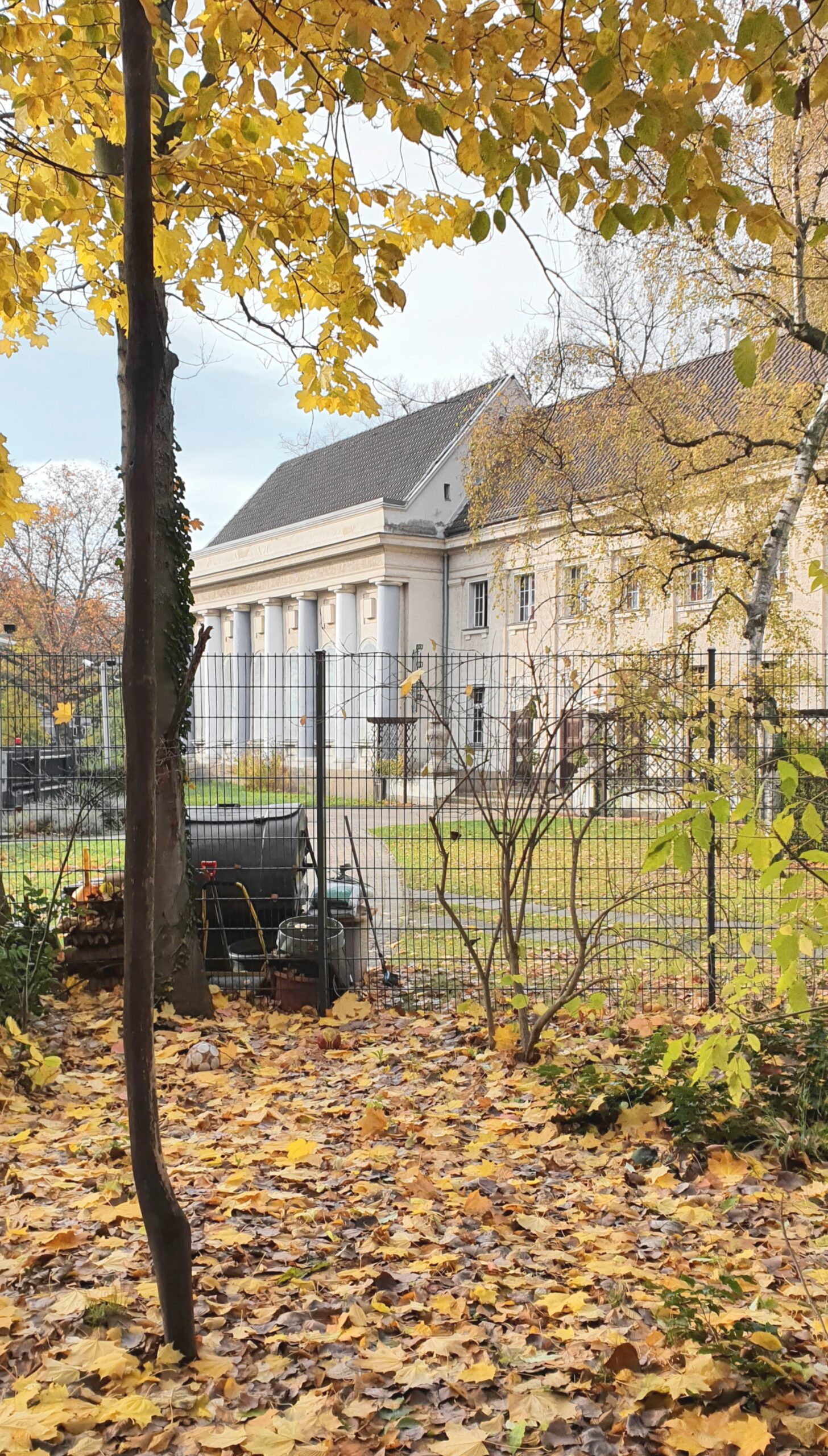 Die ehemalige Jugendsynagoge ist heute der einzige erhaltene Teil des einstigen Ensembles. Hinter Zaun, Baum und Laub verborgen, markiert sie den Ort, an dem sich einst der monumentale Portikus der Hauptsynagoge erhob.