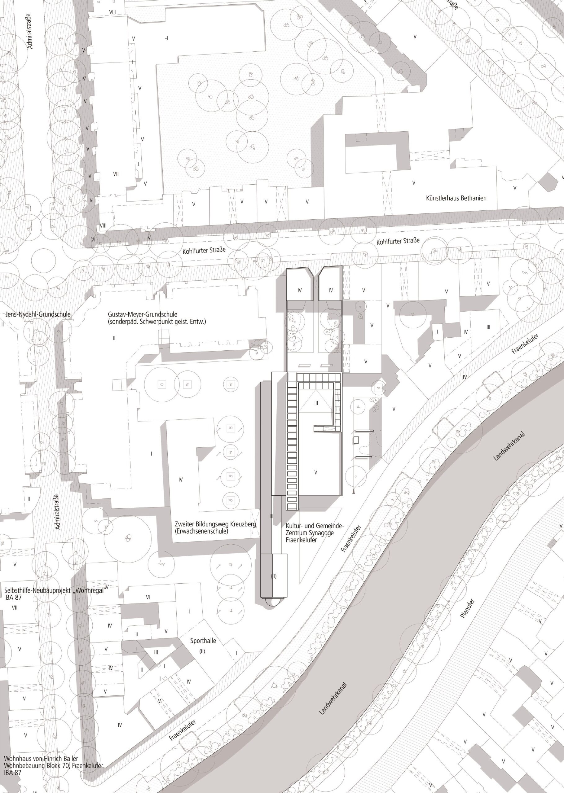 - Eine vergleichbare bauliche Lösung wurde beim Erweiterungsbau der Jüdischen Oberschule in Berlin-Mitte realisiert, um auszuschließen, dass aus den benachbarten Gebäuden ein gefährdender Zugriff auf den Innenhof erfolgen könnte – etwa durch das Einwerfen eines Sprengkörpers. ↩︎