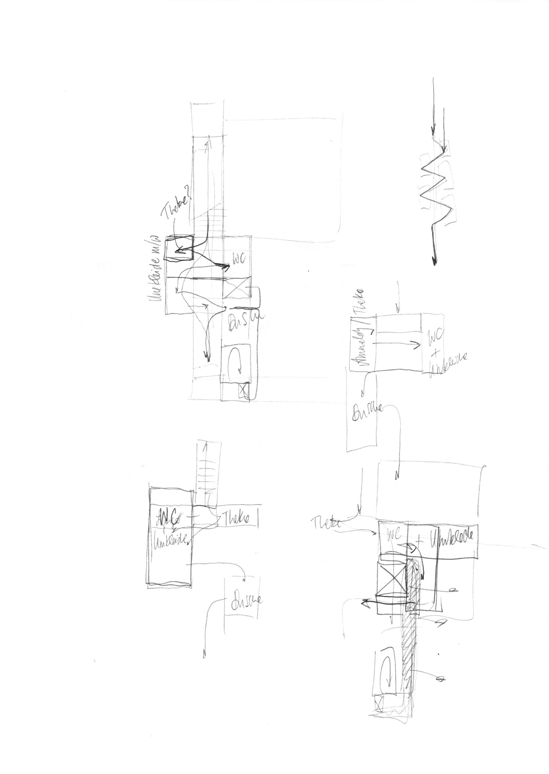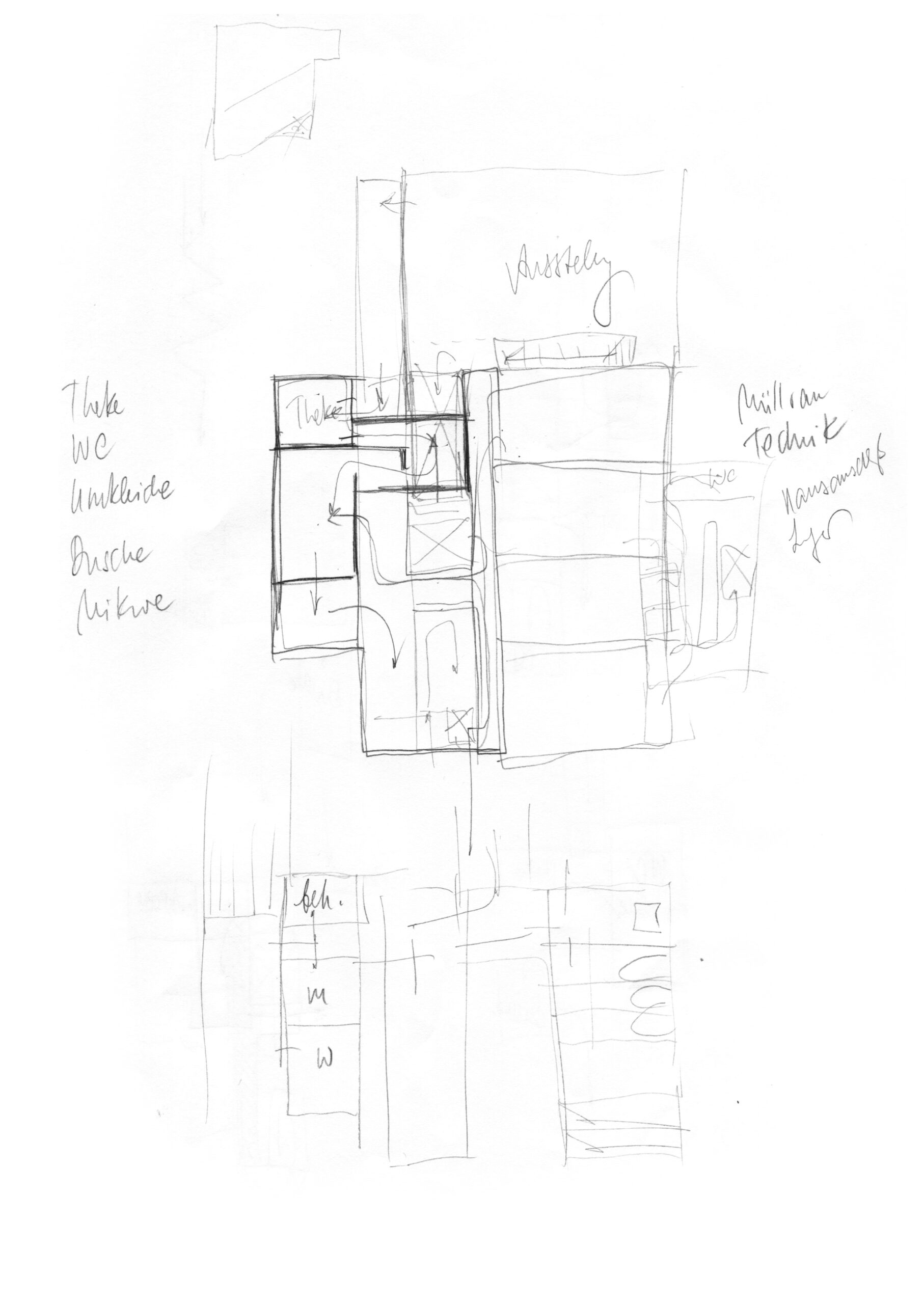 Die mögliche Verwendung von Grundwasser war historisch oftmals der entscheidende Grund, weshalb Mikwen in den mittelalterlichen Synagogen in Tiefkellern angelegt wurden, wie etwa die Mikwe in Erfurt, Köln oder Speyer. Diese Tradition jüdischen Lebens in Deutschland wird auch hier aufgegriffen. Damit das Wasser zur rituellen Reinigung aber stets erneuert wird, konnten Mikwen auch in Flussnähe eingerichtet werden. Auch die prozessionsartige Inszenierung des Bewegungsablaufes in den Grundrissen dieses Projekts spielt eine oftmals entscheidende Rolle: Der Besucher steigt die Treppe vom hofseitigen Eingang in die Mikwe hinab und mäandert durch eine organisch gefaltete Enfilade von Raum zu Raum – ein Bewegungsablauf, der an die gewundene Struktur innerer Körperlandschaften erinnert und den Weg des Wassers durch natürliche Systeme nachzeichnet, ehe er geradeaus in das Wasser hinabsteigt.