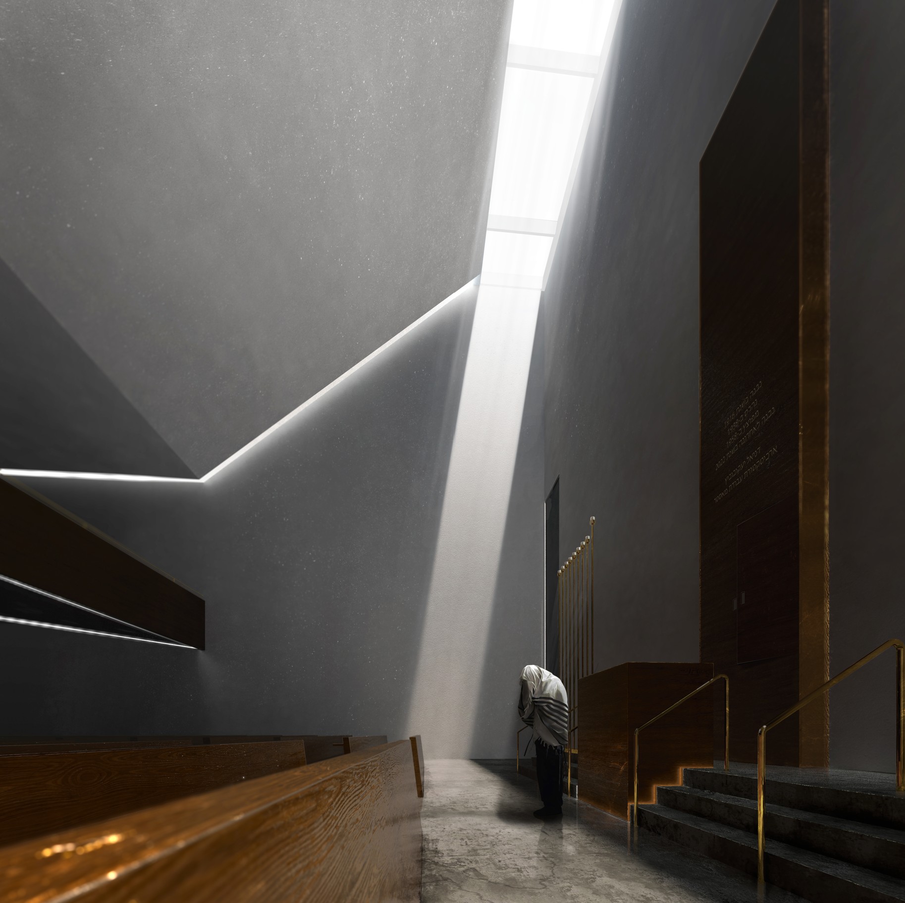 Wie bereits in der Synagoge ist ein Lichtspalt die einzige natürliche Lichtquelle. Sie befindet sich über dem Eingang in jenes Treppenhaus, das zu Gott hinaufführt. Dadurch schließt sich symbolisch der Kreislauf, und das Oben und das Unten, der Anfang und das Ende werden miteinander verbunden. Die Gehwegplatten, die dabei vom Ufer über den Vorplatz zum Haupteingang führen, verdichten sich und werden immer schmaler, bis die letzte Platte vor dem Eintritt in das Treppenhaus durch mattiertes Glas ersetzt wird, das natürliches Licht in die Mikwe leitet. Wie im Zwischenraum, der das Entrée zur Festtagssynagoge bildet, steht der Besucher vor dem Eintritt in das Gebäude auf einem gläsernen Spalt wie an der Schwelle zwischen zwei Welten. Dieser Moment des Übergangs – vom Profanen zum Sakralen, vom Außen in das Innere, vom Sichtbaren ins Verborgene – markiert nicht nur einen physischen Richtungswechsel, sondern auch eine metaphysische Schwelle, an der sich Wahrnehmung und Bedeutung überlagern.