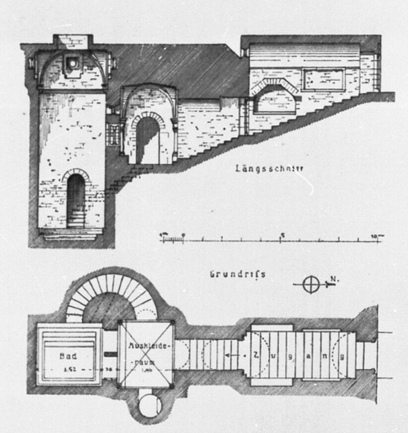 Dieses historische Element aufgreifend, entsteht eine Gegenbewegung, ein Gegenpol, der nicht zu Gott hinaufsteigt, sondern in die Tiefe führt, nicht zum Licht geleitet, sondern in die Dunkelheit lockt, nicht zum Ende eines langen Weges führt, der bei Gott endet, sondern geradewegs zum Anfang, in das Fruchtwasser, in die Gebärmutter, in der nichts den Kontakt zwischen der nackten Haut und dem Wasser stören darf. In Vorbereitung auf diesen rituellen Abstieg sind vorgelagerte Räume vorgesehen, die der leiblichen Entäußerung und Reinigung dienen, in denen sich die Hülle des Alltags abstreifen lässt, ehe der entblößte Körper sieben Stufen in das stille, wartende Wasser hinabsteigt. Dieser Akt gleicht einem Abstreifen des Alltäglichen und Profanen, einer symbolischen „Entäußern des Selbst“, also auf ein Sich-hüllenlos-machen in körperlicher und spiritueller Hinsicht, – von Kleidung, Gerüchen, kosmetischen Resten und vielleicht sogar von jenen Zuschreibungen, die das Ich im sozialen Raum definieren. Erst dann, nackt und gelöst, tritt es dem Wasser entgegen.