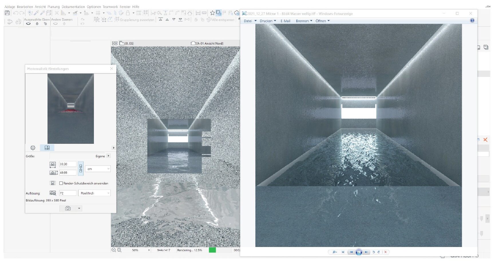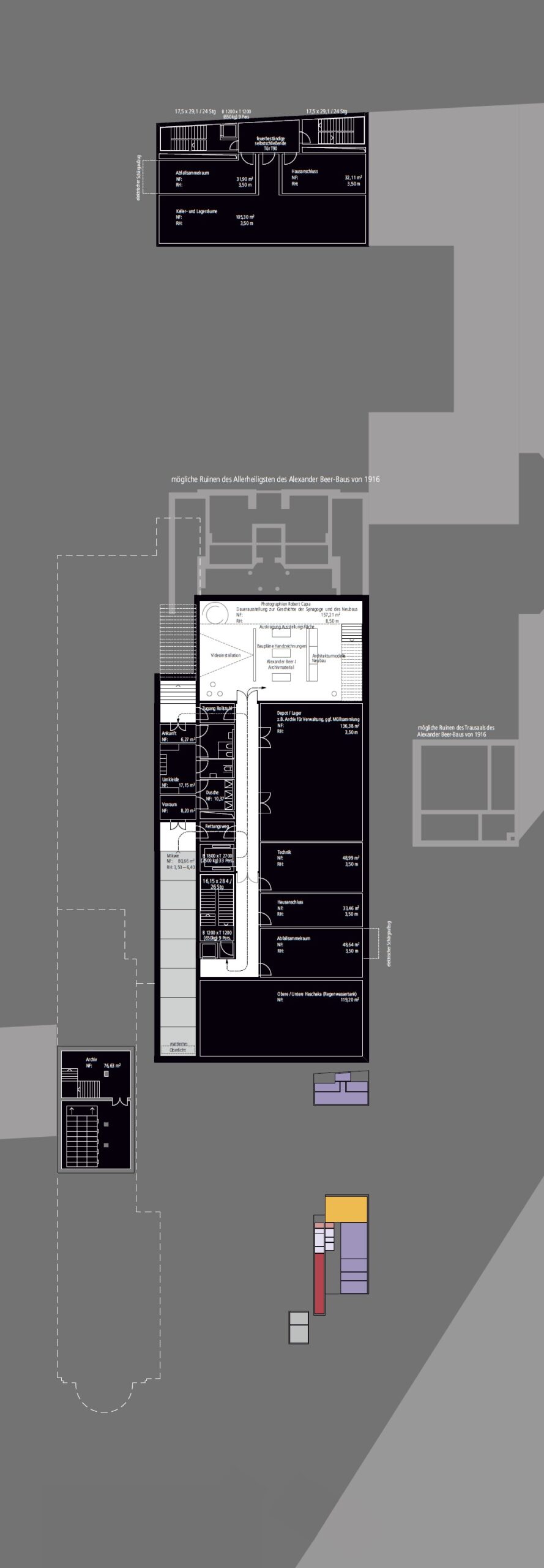 Auch befindet sich vor dem Gebäude eine Wiesenfläche, die als technische Retentions- und Versickerungszone fungiert. Das dort gefilterte Niederschlagswasser kann über ein Rohrleitungssystem der technischen Gebäudeausrüstung in ein unterirdisches Speichersystem im Kellergeschoss geleitet werden. Die dort angeordneten Wassertanks könnten entsprechend halachischer Vorschriften in zwei Wasserkammern unterteilt werden – eine obere und eine untere, sogenannte „Haschaka“ –, die durch eine Öffnung hydraulisch verbunden sind. Auf diese Weise ließe sich ein kontinuierlicher Kontakt zwischen dem ursprünglich eingebrachten lebendigen Wasser und dem gegebenenfalls ergänzten Wasser aus städtischer Versorgung herstellen. Die Wartung und Kontrolle der Anlage könnte über Domschächte mit integrierten Zugangspunkten erfolgen, um eine regelmäßige technische Inspektion durch das zuständige Fachpersonal der Gebäudeausrüstung sicherzustellen.