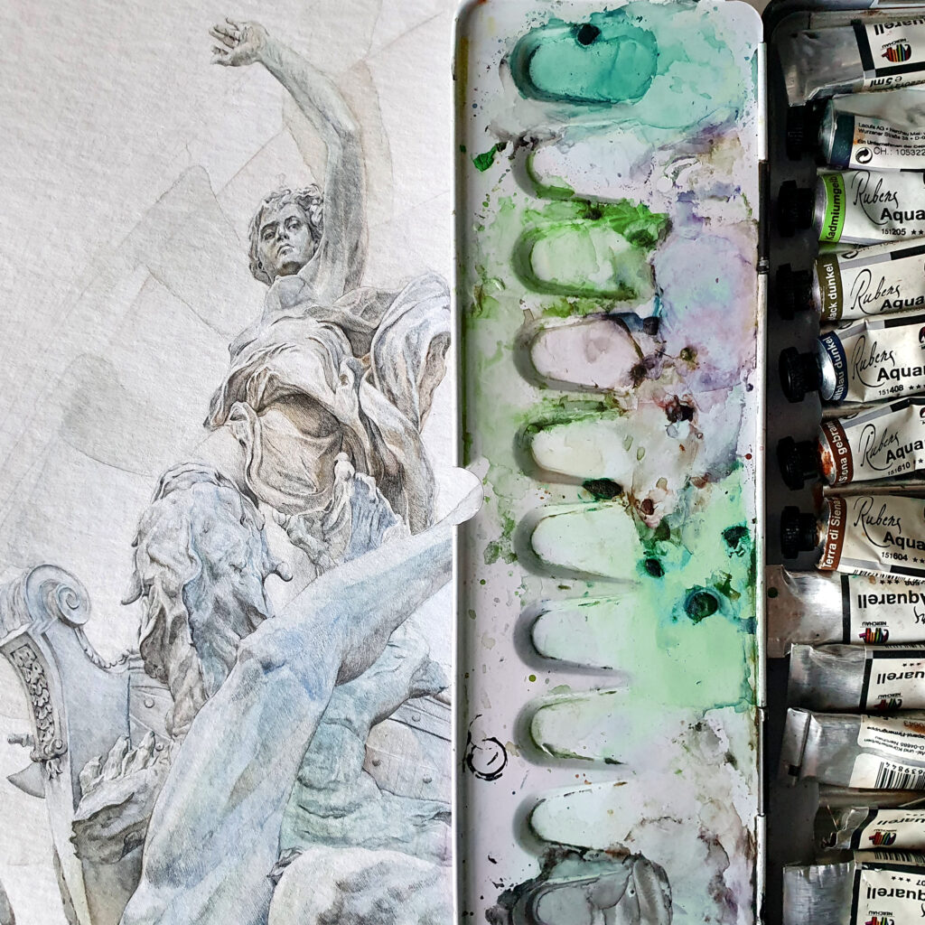 Krieg ist aber mehr als ein menschliches Drama. Krieg prüft die Stadt mit Stahl und Feuer – ein unerbittlicher Lektor, der kürzt und nimmt. Er vernichtet historische Silhouetten, tilgt steingewordene Zeugen, radiert materielle Gedächtnisträger aus, lässt Marginalien im Stadtbild stehen und reißt bisweilen ganze Seiten heraus. Aus diesen Resten von Schönheit erlas mein Urgroßvater eine Bild, deren Monumentalität und Pracht weniger schmückte als bezeugte. Dieser Rest von Schönheit lenkt den Blick weg vom Gefechtsbild hin zum Schadbild – und aus diesem Befund heraus zu einer Stadt, die sich als Archiv der Epochen offenbart. Jede Fassade ein Nachschlagewerk der Zeit, jedes Gesims der Randvermerk einer Epoche, jedes Stuckelement eine Kommentarglosse, jeder Riss ein Eselsohr im Buch des Stadtgedächtnisses, jedes Graffiti ein Palimpsest, das den Entstehungskontext überschreibt.