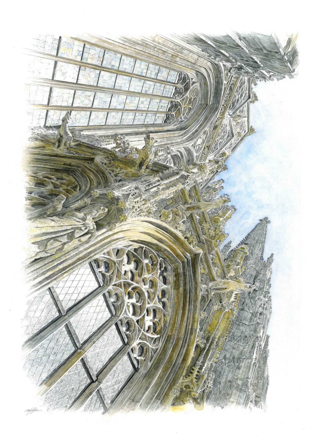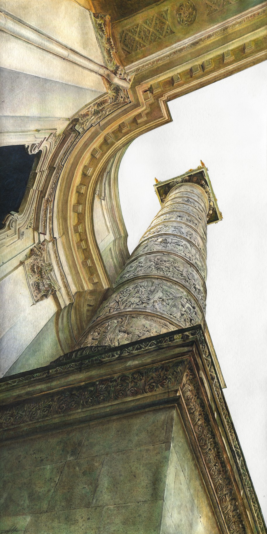 Mischtechnik: Aquarell, Graphit und Farbstift auf Karton, 60 × 40 cm (Blatt), signiert u. l.; Darstellung der Karlskirche (Karlsplatz), Wien.