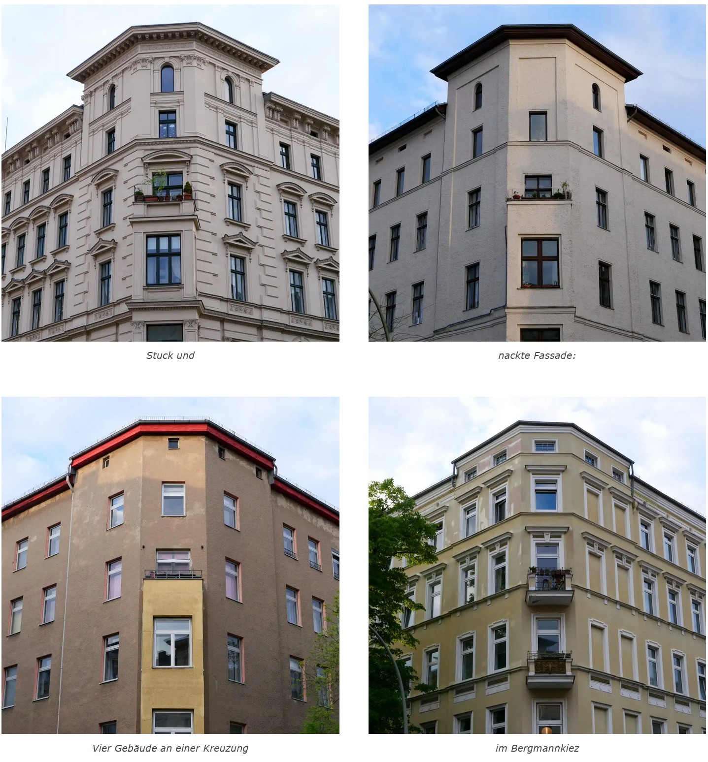 „‚Nicht nur das gewöhnliche, sondern auch das sogenannte herrschaftliche Miethshaus steht noch vielfach im Banne einer in gegossenem Gipsstuck angeklebten Monumentalarchitektur‘, schreibt der Architekt Theodor Goecke im Standardwerk Berlin und seine Bauten von 1896. Das hatte auch wirtschaftliche Gründe: ‚Die überreiche Gestaltung der Schauseiten, der Treppenhäuser und Zimmerdecken entspringt oft nur dem Triebe, eine möglichst hohe Einschätzung zur Feuerkasse und damit die Hinaufschiebung der Beleihungsgrenze zu erzielen‘, so Goecke. Eine aufwendige Fassadengestaltung erhöhte die Baukosten um etwa zwei Prozent, steigerte aber den Beleihungswert des Hauses um bis zu 20 Prozent.“