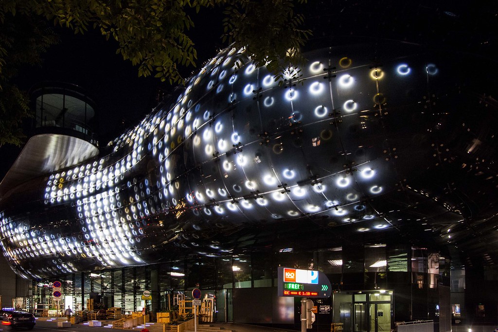 Graz, Kunsthaus bei Nacht (Hyperillusion Graz, 2015). Photo: Markus Wintersberger, Lizenz: CC BY-NC 2.0, via Flickr.