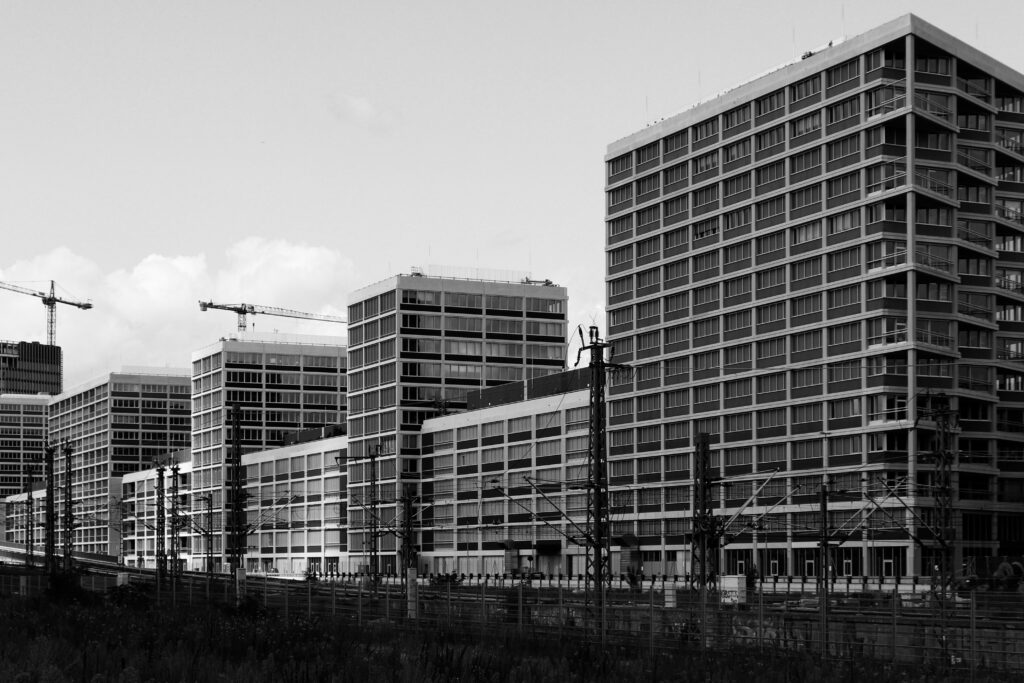 In den gegenwärtigen Quartieren lassen sich demgegenüber zwei typische Strategien beobachten: Zum einen jene großformatigen Blöcke, die entlang einer Hauptstraße als durchlaufender Baukörper entwickelt und anschließend minimale Höhenversprünge und wechselnde Putz- oder Klinkerfelder in scheinbar mehrere „Häuser“ zerteilt werden – ein Verfahren, wie man es exemplarisch an den langen Riegeln der Europacity findet. Hier bleibt die Parzelle nur als Fassadenmotiv simuliert; der Stadtraum erlebt faktisch einen einzigen, schwer artikulierbaren Baukörper.