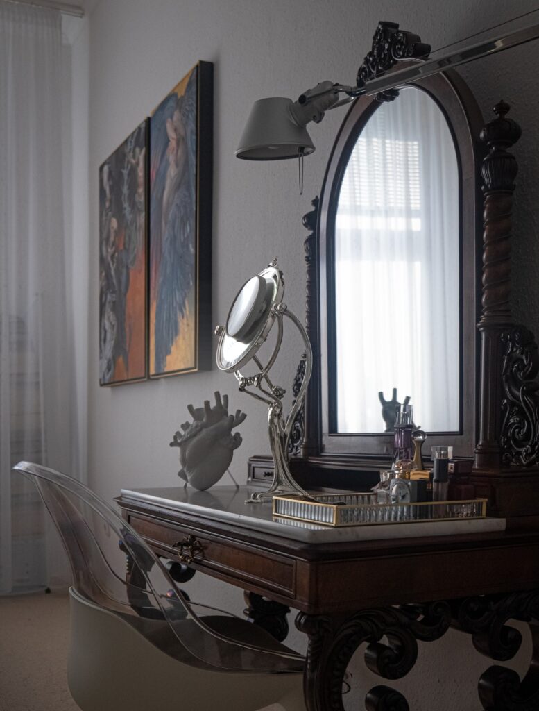 In hundert Jahren wird nichts davon mehr uns gehören. Andere werden dort wohnen, wo wir heute wohnen. Andere werden auf diesen Stühlen sitzen, auf denen wir sitzen. Andere werden in diese Spiegel blicken und an diesen Schalen achtlos vorübergehen – oder sie neu lieben. Man darf sich nicht täuschen: Man sammelt nicht Dinge. Man sammelt Zeit. Man kartiert das Verschwinden, trägt Geschichten zusammen und (er)trägt Erinnerungen zusammen. Aber für einen Moment – diesen flüchtigen, widerspenstigen Moment – halten wir die Dinge fest. Und vielleicht, nur vielleicht, wird etwas von dem, was wir hier bewahrt haben, einmal erzählen können: dass wir da waren.
