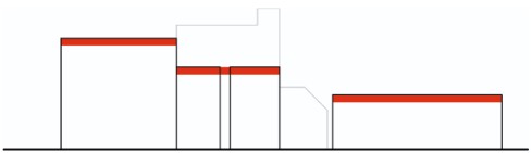 Die funktionale Erschließung der unterirdischen Versorgungseinheiten (Hausanschlussraum, Mieterkeller und Müllsammelstelle) erfolgt über einen Schrägaufzug, der eine Anbindung an die logistische Erschließungstraße zur Versorgungseinheit der benachbarten Schule sicherstellt. Die Müllentsorgung erfolgt über denselben Anlieferungspunkt, wodurch eine klare Trennung zwischen Besucher- und Betriebsverkehr gewährleistet ist. Für die Unterbringung der genannten Funktionen ist ein kompakter Baukörper mit vier oberirdischen Vollgeschossen ausreichend.