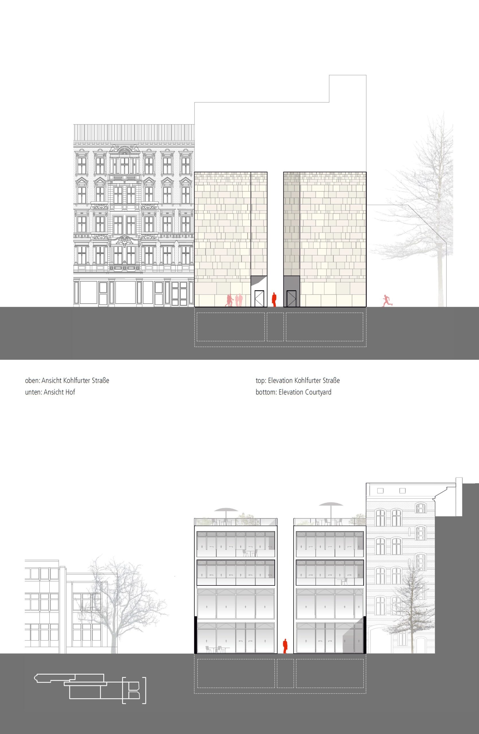 Neben dem südorientierten Eingang wird somit ein zweiter formuliert, der die funktionale Raumordnung der alten orthodoxen Beer-Synagoge mit ihren zwei janusköpfigen Gesichtern – zur Stadt und zum Ufer – aufgreift. Es entstehen thematisch und atmosphärisch divergierende Eingangssituationen, die es ermöglichen, ein derart komplex zugeschnittenes Grundstück von mindestens zwei Seiten des Wohnblocks unterschiedlich zu bespielen: Während sich im Süden eine weltliche Fassade mit Fenstern für Verwaltungs-, Bibliotheks- und Gemeinderäume sowie Konzertfoyers eröffnet und der Vorplatz mit seiner breiten Glasfront durch ein Café belebt wird, ist der nördliche Eingang weitaus schmaler, enger und führt zu einer schlichten Gedenkstätte. Obwohl beide Fassaden – dem jeweiligen Publikumsverkehr entsprechend – unterschiedlich breite und unterschiedlich einladende Eingangssituationen aufweisen, stellt das Treppenhaus in die Synagoge und die Mikwe in beiden Fällen den Haupteingang dar.