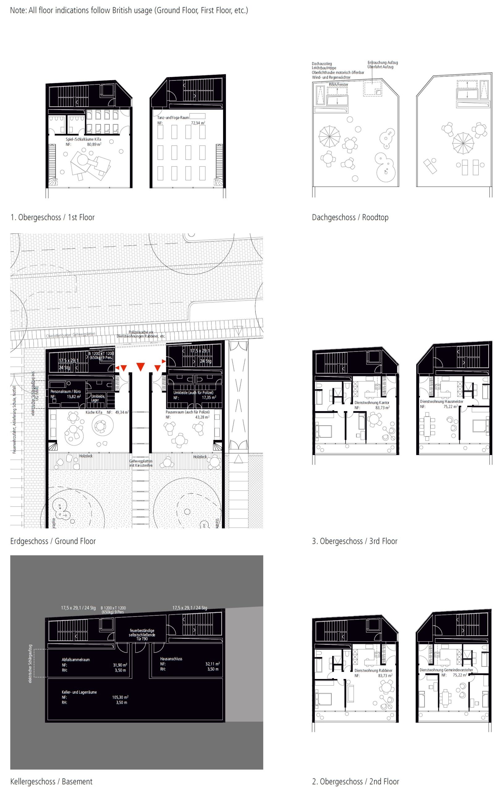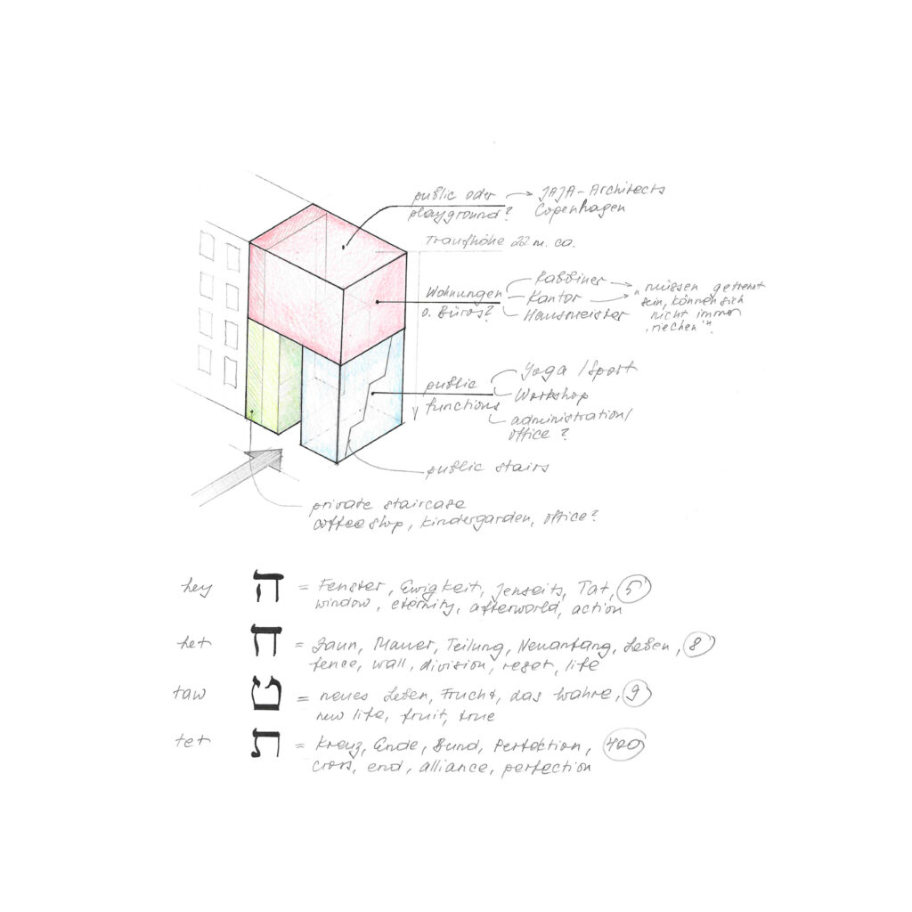 Durch den in der Sockelzone des westlichen Gebäudes untergebrachten Kindergarten und das Tanzstudio mit angeschlossenen Pausen- und Umkleideräumen im östlichen Gebäudeteil spannt sich gemeinsam mit der gegenüberliegenden Gedenkstätte ein Raum auf, in dem sich der heitere Ton des Alltags Schritt für Schritt in eine Andacht überführt wird – je weiter man vordringt, desto stiller wird es. In ähnlicher Weise befinden sich ein ehemaliger jüdischer Friedhof und eine Gedenkstätte anstelle des zerstörten Jüdischen Altersheims gegenüber dem Schulhof der Jüdischen Oberschule (seit 2012 Jüdisches Gymnasium Moses Mendelssohn) in der Großen Hamburger Straße – und veranschaulichen damit die Koexistenz der Erinnerung mit dem unaufhaltsamen Fortgang des Lebens selbst.