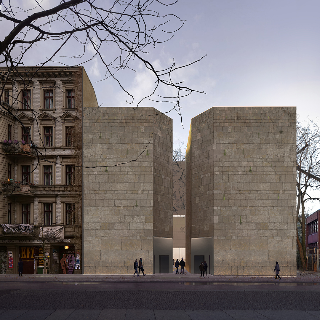 Wie ein leicht aufgezogener Theatervorhang ermöglicht der Einschnitt einen Blick in die Tiefe des Grundstücks – auf die Gedenkstätte, wo sich einst das Allerheiligste befand. Die straßenseitige Anordnung der Erschließungskerne verleiht dem Volumen eine klare, monolithische Ausprägung und erzeugt durch die bewusste Abwesenheit transparenter Elemente eine kraftvolle, beinahe archaische Fassadenwirkung. Die dadurch entstehende massive Erscheinung betont nicht nur die funktionale Trennung von Innen- und Außenraum, sondern kanalisiert auch gezielt die Wahrnehmung des Betrachters.