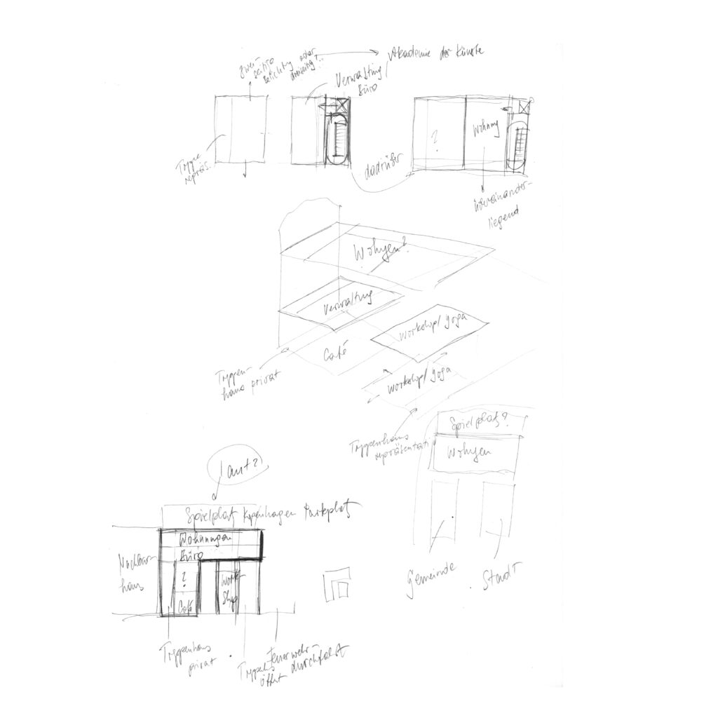 Im Zuge der baulichen Wiedererschließung des Grundstücks zwischen Fraenkelufer und Kohlfurter Straße soll diese Überlegung Beers Wirklichkeit werden: Im nördlichen Teil des Grundstücks befindet sich ein Wohnhaus, das dem Komplex zugeordnet wird. Darin werden programmatische Funktionen untergebracht, die zwar integraler Bestandteil des Gesamtnutzungskonzepts sind, jedoch nicht in unmittelbarer räumlicher Nähe zu den publikumsintensiven Bereichen des Hauptgebäudes angesiedelt werden sollen. So befinden sich im Sockelgeschoss ein kompakter Kindergarten sowie nutzungsflexible Bewegungsräume mit Fokus auf Gesundheits- und Freizeitangebote wie etwa Yoga. In den oberen Geschossen sind urbane Wohnformen in Form von Dienstwohnungen untergebracht, ergänzt durch gemeinschaftlich nutzbare Dachgärten mit Flächen für Urban Gardening.